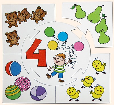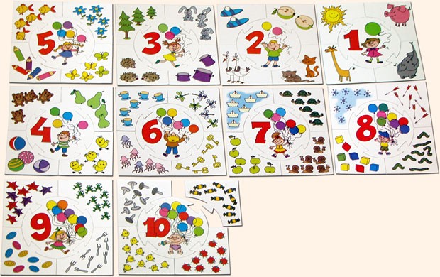 Набор состоит из 10 больших сборных карточек-блоков. Каждый блок в свою очередь состоит из пяти фигурных карточек, снабженных пазловыми замками. На центральной карточке каждого блока изображена цифра и соответствующее ей количество надувных шаров, а на 4 угловых карточках – по столько же героев или предметов.