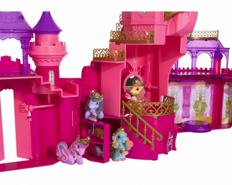 В замке есть красиво украшенный танцевалный зал, балкон, различные лесенки, тайная комната, качели и карусель для веселых игр любимых лошадок, а также камин, где можно "погреться" (пламя в камине имитация-наклейка), читальный зал и комната с зеркальцем, где лошадки смогут подготовиться к танцевальному вечеру.