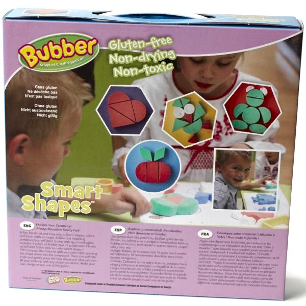 Набор "Smart Shapes", который уже включает в себя четыре порции Bubber разных цветов, набор формочек и руководство для игр.
