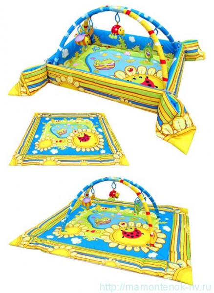 Развивающий игрушка- коврик выполнен из ткани различных фактур и приятных на ощупь.Подвесные игрушки со звуковыми эффектами, могут использоваться как отдельные погремушки.