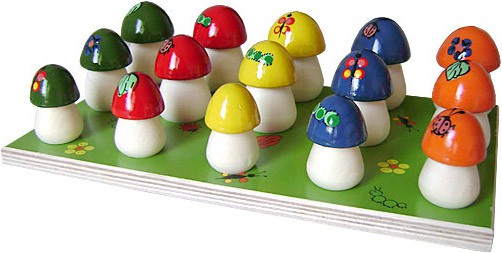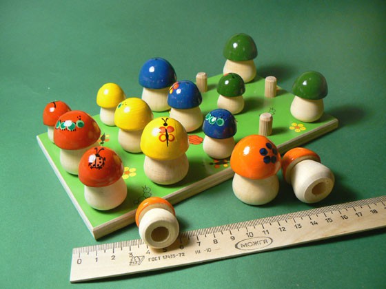 В комплекте пятнадцать разноцветных грибочков с отверстием в основании для нанизывания на стержни и подставка. Грибы пяти цветов и трёх размеров: маленькие, средние и большие. На шляпках грибов три типа рисунков: жучок, листок и цветок.