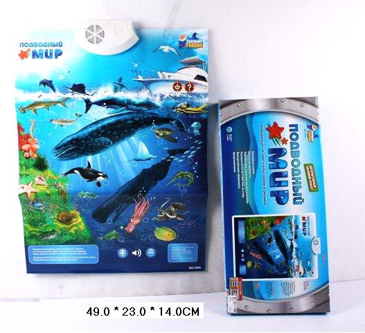 На плакате изображены морские обитатели: осьминог, акула, дельфин, кальмар и другие. Возле каждого животного находится кнопка, нажав на которую, ребёнок сможет послушать информацию о морском обитателе и услышать, какие звуки он издаёт.
