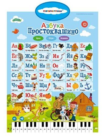 Яркий красочный плакат с любимыми героями из мульфильма Простоквашино, звуковые кнопки - буквы на которые нужно нажимать.