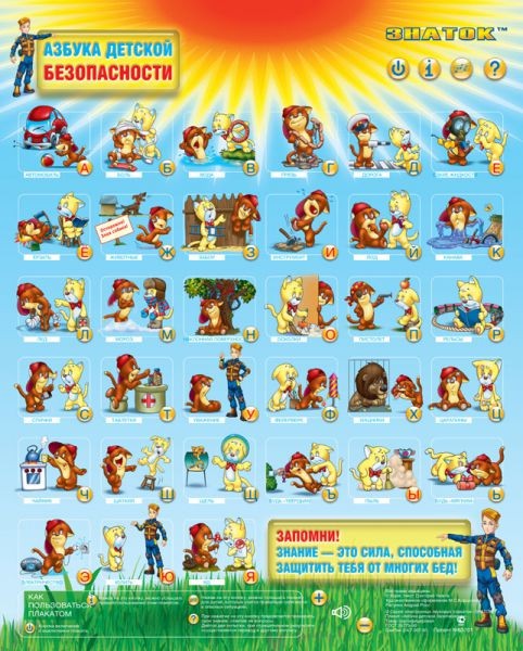 Азбука детской безопасности - это очень важный обучающий плакат для детей. На каждую букву азбуки в нём приводится ключевое слово реальной ситуации, опасной для жизни и здоровья детей. Звучат точные короткие запоминающиеся рекомендации о том, как себя вести, чтобы остаться целым и невредимым. Каждой ситуации посвящён отдельный яркий рисунок с забавными симпатичными героями. Полученные знания можно проверить и закрепить с помощью говорящего экзаменатора.