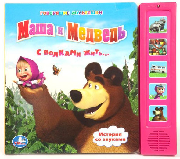 Озвученная книга (5 кнопок) «Маша и медведь. История со звуками». Внутри этой книжки — история с главными героями мультфильма «Маша и Медведь». В текст местами вставлены маленькие картинки, как на кнопках на панели справа. Если нажать на соответствующую кнопку, вы услышите звук, например, вой волков или фразу, сказанную голосом Маши. С этой книжкой вы сможете сделать чтение истории интереснее, малышу будет радостно самостоятельно нажимать на кнопки и слышать голоса любимых героев.