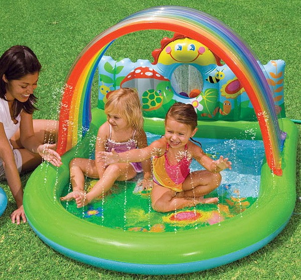 Как здорово в жаркий летний день позабавиться в водном игровом центре. Можно веселиться под брызгами фонтана, кидаться мячиками. И не нужно бояться солнышка, потому что радуга в виде навеса укроет малыша.