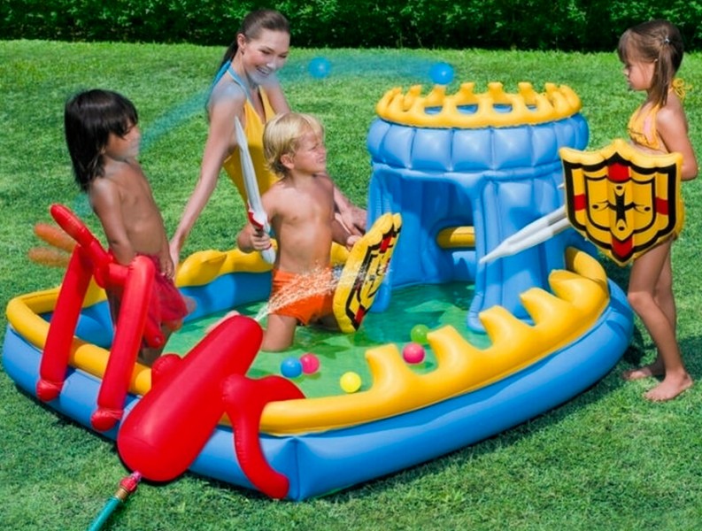 В комплекте надувная водяная пушка, которую можно подключить к садовому шлангу и надувная катапульта, стреляющая шариками для сухого бассейна. Так же в комплект входит 2 надувных меча, 2 щита, 6 пластиковых шариков.