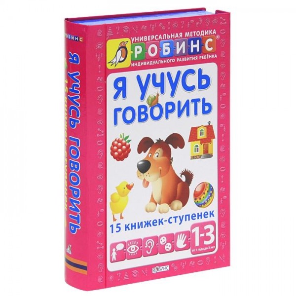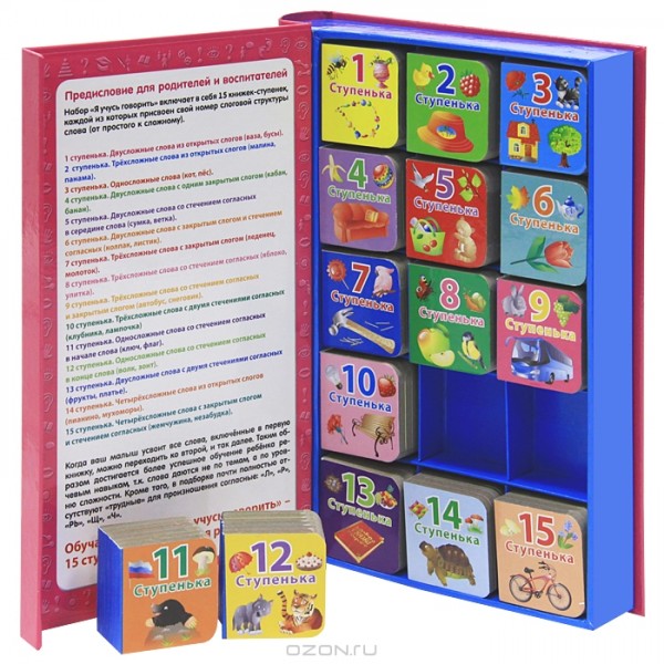 Набор от издательства Робинс специально был разработан учеными для того, чтобы ребенок быстрее и лучше научился говорить. Набор включает в себя 15 книжек-ступенек, каждой из которых присвоен свой номер слоговой структуры слова ( от простого к сложному). Каждая книжка-ступенька - очередной уровень развития речи малыша. Книжки-кубики сделаны из плотного материала, с яркими картинками. В набор входят: 15 книжек-кубиков формата 4,5х4,5 см.